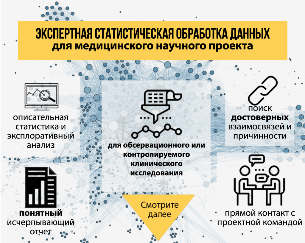 Расчетами для Вашей работы будет заниматься врач-специалист бимедицинской статистики, профильная подготовка дает возможность глубокого внедрения в каждый проект